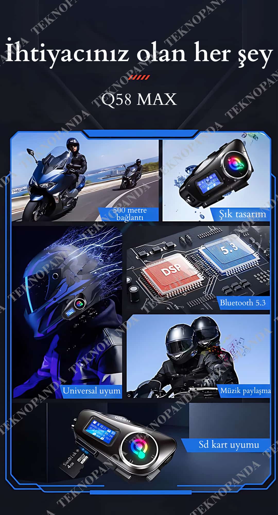 Always Q58 Max 500m Telsiz Mesafeli Motosiklet Kaskı İnterkom Çift Sürücü İletişimi Mp3 FM Radyo