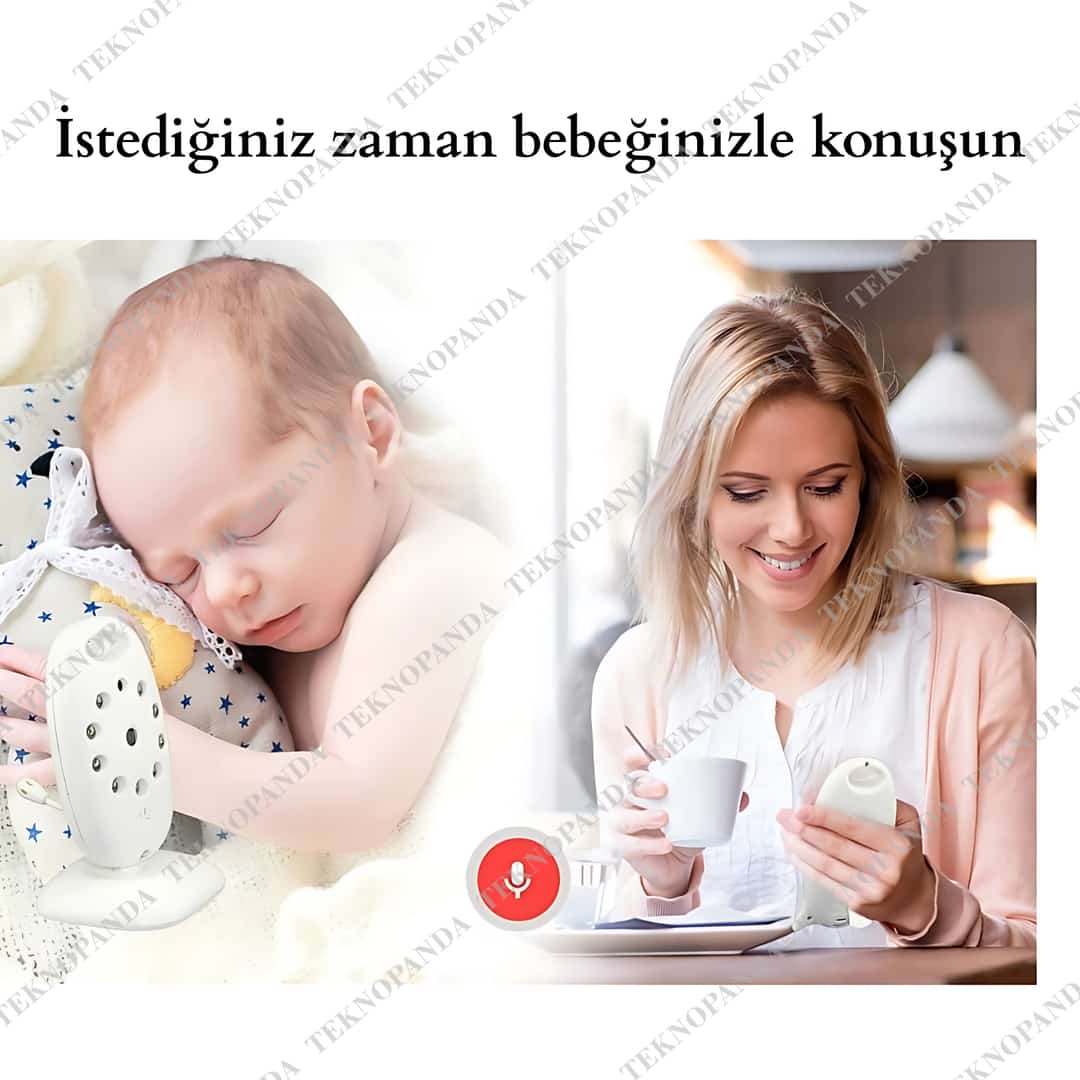 Ayrıca monitör üzerinde bulunan mikrofon işaretli düğmeye basılı tutarak konuşarak sesinizi bebek kamerası üzerindeki hoparlör yardımıyla bebeğinize duyurabilirsiniz.